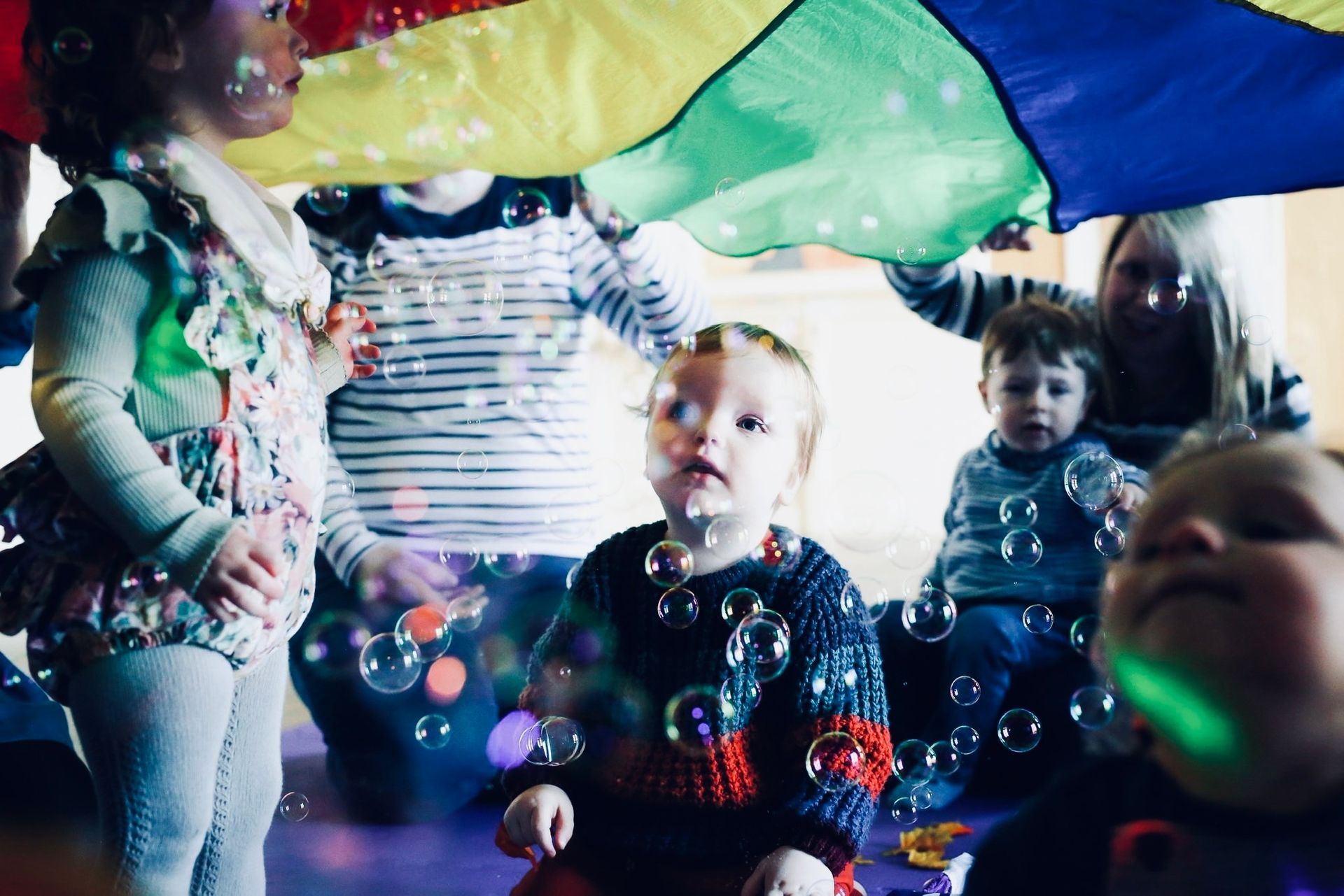 Our sensory play elements include the absolute favourite “what’s in the box” puppets, bubbles, parachutes, twinkly lights and a whole host of other props for them to use in structured play to stimulate all of their senses.